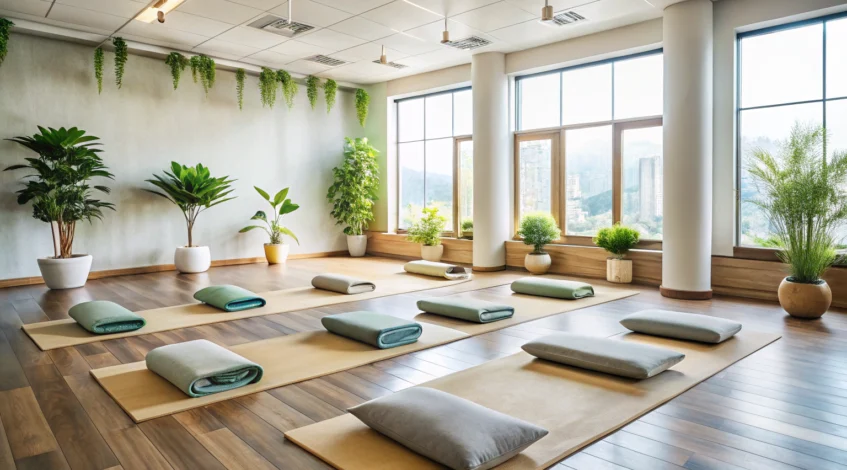 A peaceful yoga studio with natural light, wooden floors, and neatly arranged yoga mats, surrounded by green plants and soft lighting, creating a tranquil atmosphere
